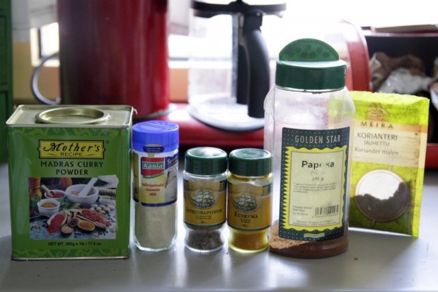 [b]4.[/b] Luulitko jo maustaneesi ruoan? Ehei, pääsimme vasta alkuun. Charmilla on oma Intiasta tuotu curry-jauheensa, mutta minä olen ostanut tuollaista valmiskamaa (vihreä purkki). Sitä reilu teelusikallinen tai pari, valkosipulia, sitruunapippuria (ihan kuulkaa Charmin reseptin mukaan!), mustapippuria, kurkumaa, paprikaa ja jauhettua korianteria oman maun mukaan. Charmin ohjeessa oli 0,5 tl – 2 tl, mutta en muista niitä määriä. Chiliäkin saa laittaa, jos oma curryjauhe ei ole kovin tulista (minun ei ole). Anna kiehua kokoon n. puoli tuntia.
