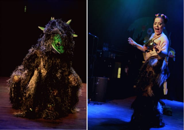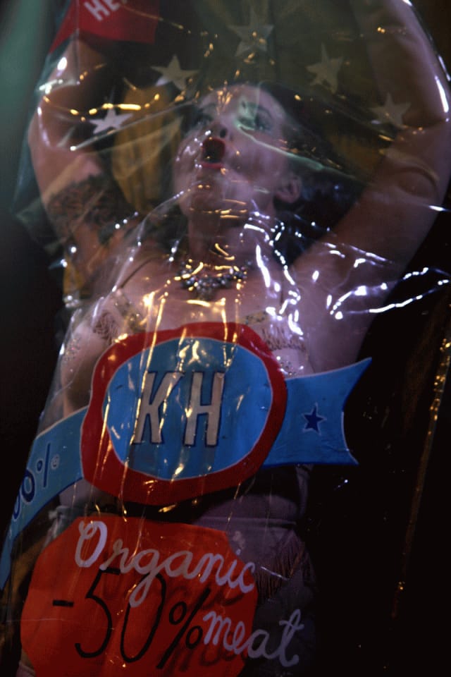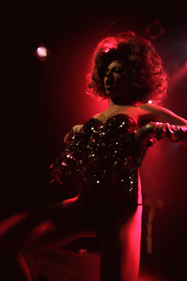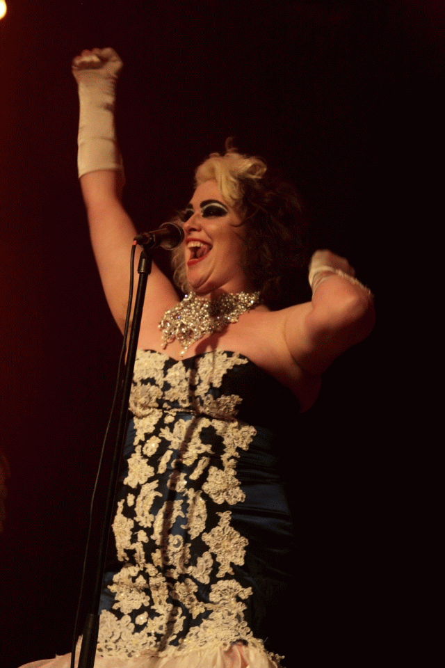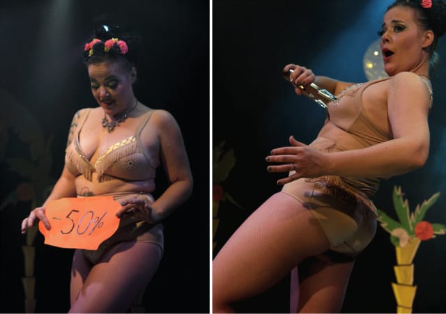Illan auvoisa emäntä, Turku Burlesquen kuningatar Kiki Hawaiji esiintyi kahteen kertaan. Molemmissa esityksissä oli loistava idea: ensimmäisessä lavalle pääsi suohirviö ja toisessa KH:n lenkkimakkara. Pitää vaan ihmetellä, mistä nämä ideat oikein syntyvät 😀