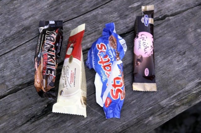 Onneksi en ole menettänyt lapsellisuuttani ihan vielä. Ostimme evääksi Cittarin patongit. Huom, en hyödy mainostuksesta, mutta suosittelen silti: patonki maksaa 3,16 e ja on ihan superiso ja -herkullinen! Nam nam. Jälkkäriksi ostimme erilaisia suklaapatukoita, joita emme ole ennen maistaneet. Tässä niistä jäljellä vain kuoret: