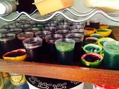 Jelly-shotteja! Voisiko näitä sanoa hyyteloshoteiksi? Hyytelöpaukuiksi? No, miten vaan, toivottavasti onnistuvat 🙂 Tämä on eka kerta kun näitä teen, ja kuten kaikki AMI-ohjelman katsoneet ehkä tietävät, en omista mitään mittoja, joten nesteet ja liivatteet ovat summamutikassa. Tein kolmea eri sorttia: ällövihreitä lime-mandariinishotteja, verenpunaisia mustaviinimarjashotteja ja synkänmustia turkinpippurishotteja. [b]Ohje:[/b]