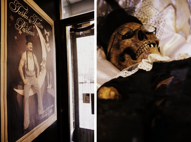 Turku Tattoo Parlour on ihan omaa luokkaansa oleva tatskapaikka. Koko liike on oikeastaan taideteos. Yritin kuvata kaiken, mitä liikkeessä oli, mutta eihän se ollut mahdollista. Siellä pitää itse käydä! Lisäksi tietysti henkilökunta osasi asiansa ja oli todella miellyttävää. Kun kävin ottamassa ensimmäistä tatuointiani eräässä toisessa liikkeessä Turussa, sain melkein traumoja, sillä tatuoija oli todella ilkeä. Hän suhtautui minuun kuin pikkutyttöön, joka on innostunut värittämään ihoaan. TTP:ssä tällaisesta ei ollut tietoakaan! Olin todella, TODELLA tyytyväinen lopputulokseen ja menen varmasti uudestaankin. Itseasiassa minulla on jo lista kuvista, mitä pitäisi tehdä… Käteni on ihan keskeneräinen vielä: kuvien väliin tulee taustaa, jota itseasiassa alettiin jo tehdäkin. En malta odottaa uutta aikaa!