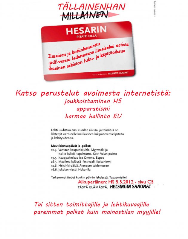 Mikäli taas uskoo Helsingin Sanomien olevan; tällä muunnellulla HS mainoksen kiertueellaan; rehellisellä mielellä liikkeellä, niin asiakaskunnan toiveet saattavat viimeinkin toteutua. Ei ehkä kaikkein villeimmät, mutta helposti toteutettavat. Ilmaisjakelu on yksi nopeimmista.