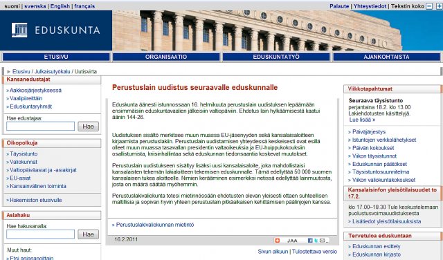 Sitä ihmettelen, että edes eduskunta tiedotuksen yhteisö ei hoida tiedonvälitystehtäväänsä. Tästäkin alla olevasta uutisesta puuttuu erittäin merkittävä perustuslain ”uudistamisen” vaikuttavuus. Seuraava lainaus on kansalainen Tapio Salmisen Helsingin Sanomissa 4.2.2011 julkaistussa…