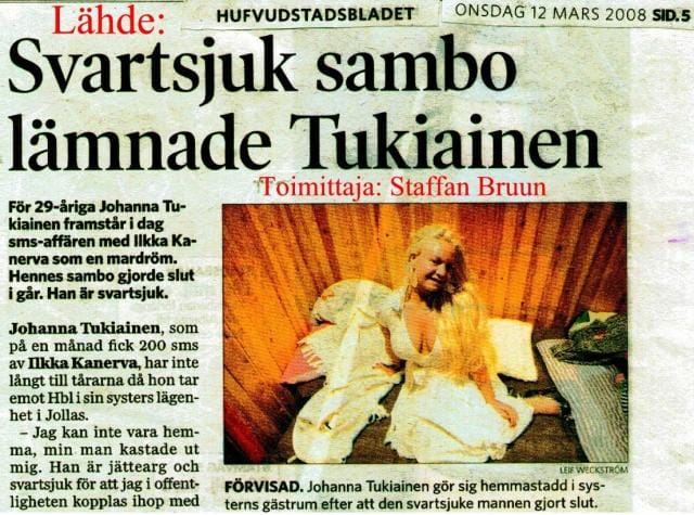 Hufvudstadsbladet julkaisi 12.3.08 lehdessä jutun Johanna Tukiaisen ja Ilkka Kanervan tapauksesta oheisen kuvituksen kera.