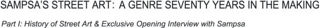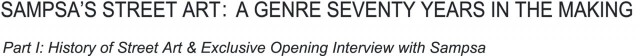 Sampsa, more than anyone out there, knows that street art can be more than a mere catalyst for new perception; it can be an initiator of direct reform. It can have a simple message and still be art. It can be a conceptual piece and still catalyze very specific change. For Sampsa, Street Art is a blueprint for a better society spayed across a city wall – a solid vision that either justifies or rebuffs the existence of the wall itself. In the 1981 indie film, [i]Downtown 81[/i], Jean-Michel Basquiat (later voiced over by [b]Saul Williams[/b]) says: “I could see the handwriting on the wall and it was mine”. I wonder if the Sampsa generation will be able to see the same wall and conclude: these words I wrote are not mine; they are the words of public consensus, they are the words that create referendums, they are the words that will become our laws. A wall, it seems, is a most perfect place to create works that will eventually tear down walls.