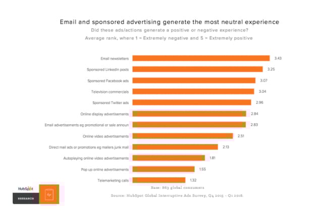 Mainostavoista neutraaleimpia reaktioita skaalalla 1-5 (1 kamala, 5 hyvä) aikaansaivat sähköpostiuutiskirjeet (3.43/5), sponsoroidut LinkedIn-postaukset (3.25/5), sponsoroidut Facebook-postaukset (3.07/5) sekä televisiomainonta (3.04/5). Myös sponsoroidut Twitter-mainokset otettiin vastaan hyvin (2.96/5).