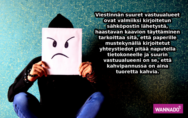 Mutta minä en halua helppoja nakkeja! En halua, että jos osaan laatia viestintäsuunnitelman, minun osaamistani ei tajuta hyödyntää vaan minulle annetaan valmiiksi kirjoitettu teksti, joka minun pitää lähettää eteenpäin – ja antaa esimiehen vielä tarkastaa, että onhan se nyt varmana oikein. Missä intohimo? Missä työntekijöiden kunnioitus ja luottamus? Mitä teen, kun työpaikalle meno vituttaa ja sen saamarin Mokkamasterin haluaisi paiskata seinään ja huutaa ”Keittäkää sumppinne itse senkin vätykset”?