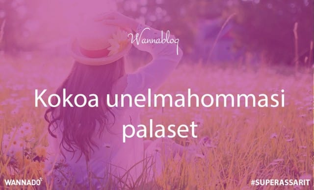 Muista – jos unelmointi sanana tuntuu sinulle liian ällömakealta pinkiltä hattaralta, niin voit mieltää asian tavoitteiden toteutumisena tai itseä tyydyttävän tilanteen saavuttamisena. Joka tapauksessa jo riittää ajatus siitä, että työn kuuluukin olla työlästä ja rasittavaa. Työ on niin iso osa arkea, että se saa olla kivaa. Nostetaan katse sinisellä taivaalla hippaa leikkiviin pilviin ja unelmoidaan!