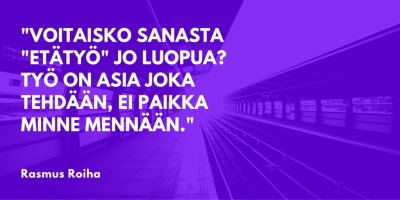 [quote]Voitaisko sanasta "etätyö" jo luopua? Työ on asia joka tehdään, ei paikka minne mennään. Työ on työtä. #työ #2015 https://t.co/xX3XZUQmdj