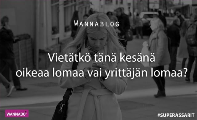 Kesälomakausi lähestyy. On se ihanaa, kun kaikkialla on WIFI ja lentokoneessakin voi nykyään pitää läppärin auki ja selata vaikka tarjouksia tai palaverimuistioita! Yrittäjän loma on sellainen, että mukana on vähintään älypuhelin, johon tulee eri kanavissa viestejä, kysymyksiä, puheluita ja sekalaisen sekavaa pikkupuuhaa. Linjojen kautta riipii myös tulipaloja sammutettaviksi, oli sitten mokailtu, unohdeltu tai jotain tehty kuitenkin väärin. Ja vaikka ei olisikaan, niin kunnon yrittäjän lomalla ollaan silti valmiustilassa ja kiristellään – just in case! Oikein hyvä yrittäjän loma alkaa jossain kohtaa stressata ihan siksi, ettei pääse kunnolla tekemään itse kaikkea – kädet saveen tyylillä, ja hotellin nettikin pätkii aina kun olisi pääsemässä vauhtiin.