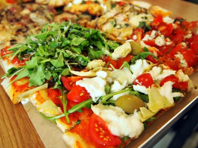 Pizzariumin pizza tehdään suurina levyinä ja myydään paloina. Makuyhdistelmät vaihtuvat päivän mittaan.