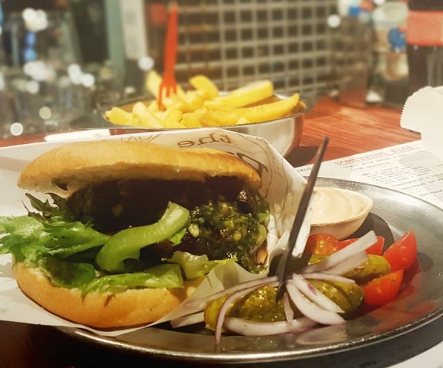 SYÖ!-viikkojen menusta Huurteelta löytyy Vegan Burger kasvis-mustapapuröstillä, vegaanisella valkosipuliaiolilla ja tikkuperunoilla.