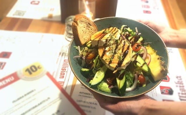 [b]Villisika[/b] on tunnettu suurista ja lihapitoisista annoksistaan, mutta ravintolassa osataan täyttää myös kasvisruokailijoiden vatsat. Jättiläismäinen vuohenjuustosalaatti sisältää esimerkiksi tuoretta ananasta ja talon leipää.