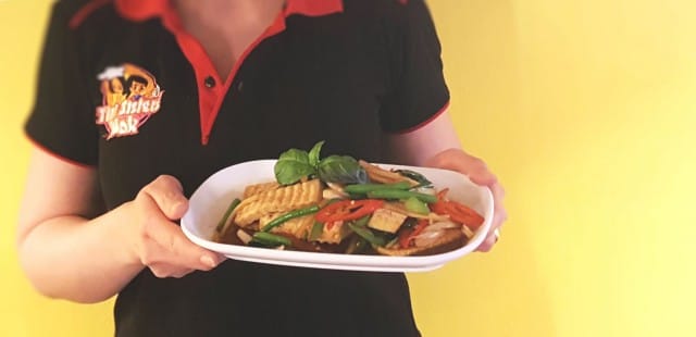 [b]Thai Sisters’ Wokissa[/b] kasvisannoksen valitsemista SYÖ!-viikkojen ruokalistalle ei tarvinnut jahkailla: Kuten aina, myös SYÖ!-viikoilla kaikki kolme ruokalistan annosta (Phat Thai, Phanang Curry ja Phat Khapau) on saatavilla joko kanalla, katkaravulla, possulla, härällä tai tofulla. Basilikanlehdillä, chilillä, bambunversoilla ja pavuilla höystetty Phat Khapau on Thaimaassa erittäin suosittu annos, ja siten luonnollinen valinta myös SYÖ!-viikoille.