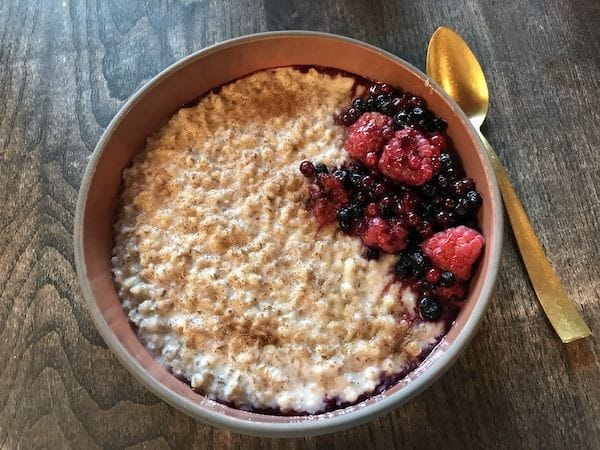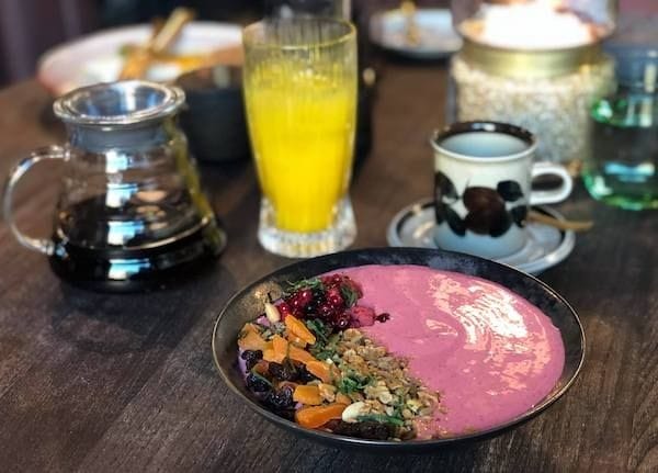 Iso annos oli myös jugurttia sisältävä smoothie bowl, johon Penélopen oma mysli ja kuivatut hedelmät toivat kivasti lisää tekstuuria ja kuivattu minttu toimi sen raikkaana lisukkeena. Bowl oli kesäisen makuinen ja kylmä, joten lämmin puuroannos toi sille mukavan makuparin. Myös puuroa katettiin varsin iso lautasellinen, täältä ei siis tarvitse jatkaa nälkäisenä!