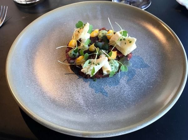 Tiiviiltä ruokalistalta löytyy tartaria, joten minulle alkuruoan valinta oli helppoa. Tartarissa on hyvä liha ja selleriä on käytetty useammalla tavalla kekseliäässä annoksessa.