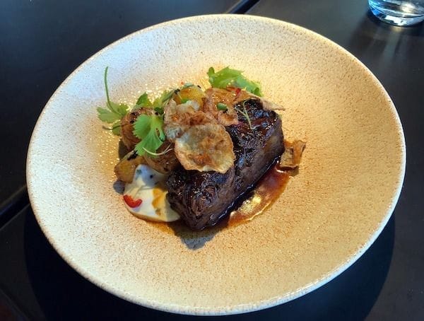 Pääruoaksi söin keväisen raikasta sitruunarisottoa ja avecini valitsivat kuhaa ja härkää, jotka olivat molemmat sekä kauniita että isoja annoksia. Pienten alkuruokien ja isompien pääruokien kombo vaikutti toimivalta. Avecini kehui kalassa olevan hyvän paistopinnan ja aidon maun.