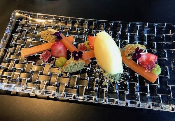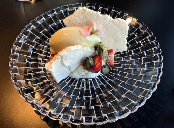Myös jälkiruoat edustivat isompaa annoskokoa, mikä on aina iloinen asia ja mainitsemisen arvoista on myös annosten kaunis esillelaitto. Juustot eivät petä koskaan ja marjapavlovassa ihastuttivat sokeroidut kuusenkerkät. Raikkaan ja pehmeän raparperin ja maukkaan pistaasikakun yhdistelmä toimi hyvin myös kolmannessa jälkiruoassa.