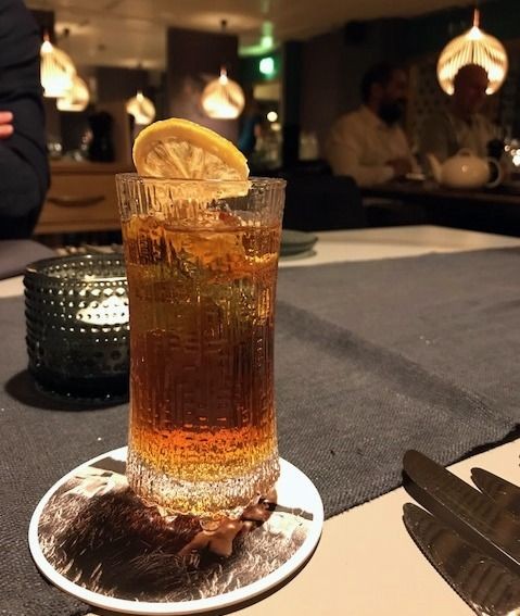 Kuohkeaa keittoa on hauskasti maustettu mäntyöljyllä ja sen lempeät maut avaavat illallisen mainiosti. Seuraavan annoksen ohra ja hirvi jatkavat lempeiden makujen linjaa. Illallisen ensimmäinen yllätys tulee tattia ja kyssäkaalta sisältävän annoksen juomavalinnassa. Tatti on paritettu klassisesti sherryn kanssa.