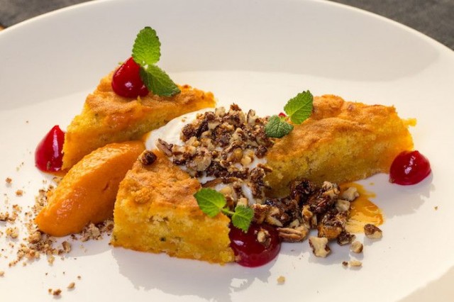Mainiosti kypsennetylle taimenelle taas oli valittu lähes yhtä klassisesti Chablista. Taimenen lisäkkeenä ollut sydänsalaatti oli erittäin maukasta ja kauniinvärisessä annoksessa oli mukavasti hapokkuutta. Juomapaketti kokonaisuudessaan sekä alkuun otetut drinkit toimivat annosten kanssa mukavasti, vaikka tatin ja sherryn yhdistelmä yllättikin meidät illallistajat. On kuitenkin hauskaa, että illallinen mahdollistaa välillä myös poistumisen omalta mukavuusalueeltaan.