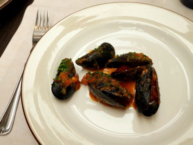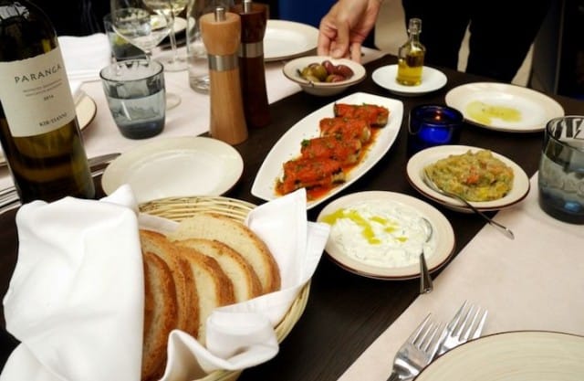 Saimme alkuun pienen pullollisen oliiviöljyä, johon dippasimme ihanan pehmeää ja tuoretta leipää. Se oli hurmaava aloitus illalle, yksinkertainen ja maukas sukellus kreikkalaisuuteen. Illallisella ruokia tuotiin pöytään paljon ja olimme kuin parhaimmankin kreikkalaisen isoäidin käsittelyssä. Maistelimme aivan kaikkea: suolaista juustoa ja makeaa hunajaa yhdistelevää fetaa filotaikinassa, munakoisoa salaattina, kääryleinä sekä haudutettuna tomaattikastikkeessa, sinisimpukoita tomaattisessa yrtti-valkosipuliliemessä, lihapullia sekä musakaa ja tsatsikia; totta kai.