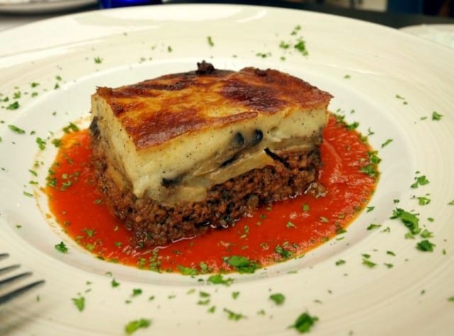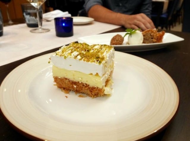 Grillatut porsaan kasslerviipaleet salaatin ja grillatun pitaleivän kanssa ovat El Grecon salonkikelpoinen versio pita gyros -katuruokaklassikosta. Se toimii loistavana yhteisnaposteltavana viinin kanssa ja on hyvässä seurassa sosiaalista ruokailua parhaimmillaan. El Grecon maahantuoma, pienen kreikkalaisen tuottajan kevyt punaviini sopi erityisesti musakan kanssa hyvin. Ilmiselvästi Kreikassa taidetaan muunkin kuin retsinan teko. Jälkiruoaksi, jota emme kaiken herkuttelun jälkeenkään voineet ohittaa, meille tarjottiin ravintolan egyptiläisen kokin erikoisuutta, sopivan makeaa Kantaifi-taikinapohjaan leivottua kolmikerroskakkua sekä klassista baklavaa uudelleenrakennettuna.