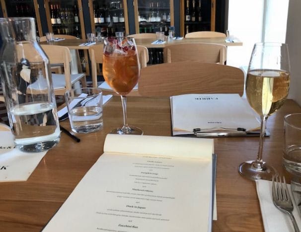 Ravintola tekee vaikutuksen jo heti illallisen alussa tarjoamalla kahta itseleivottua leipää, jotka ovat molemmat uskomattoman maukkaita. Myös alkujuomaksi kaadettu samppanja sekä Fabrikin hauska Aperol spritz -tyylinen, Tislaamon lonkerosta ja kuohuviinistä tehty cocktail antavat odottaa illalta paljon.