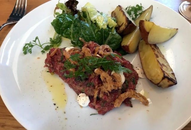 Päädyn myös itse lähes poikkeuksetta tartarin, jos sellaista on tarjolla ja se onkin ehdoton valintani pääruoaksi. Kuitenkin seuralaiseni pääruoakseen valitsema Toast skagen ennättää saapuessaan herättää minussa hieman annoskateutta. Ei tartar kuitenkaan jää sen varjoon. Annoksessa on niin paljon lihaa, että tavoistani poiketen harkitsen jo hetken jättäväni jälkiruoan väliin.