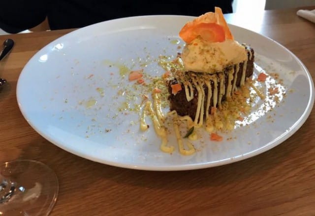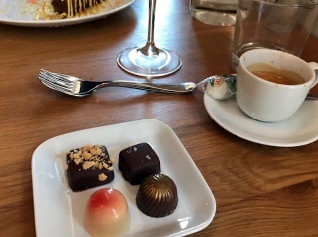 Onneksi en kuitenkaan jätä! Ravintolan erikoisuus on Pralina Chocolaterien käsintehdyt suklaakonvehdit, jotka ovat suussasulavan herkullisia ja todella kauniita. Kuulen, että niitä saa ostaa myös kotiin – apua! Seuralaiseni valitsee jälkiruoaksi porkkanakakkua appelsiinijäätelöllä. Myös se on visualisesti hyvin kaunis annos ja kakkukin kuuluu olevan hyvin maistuvaa.