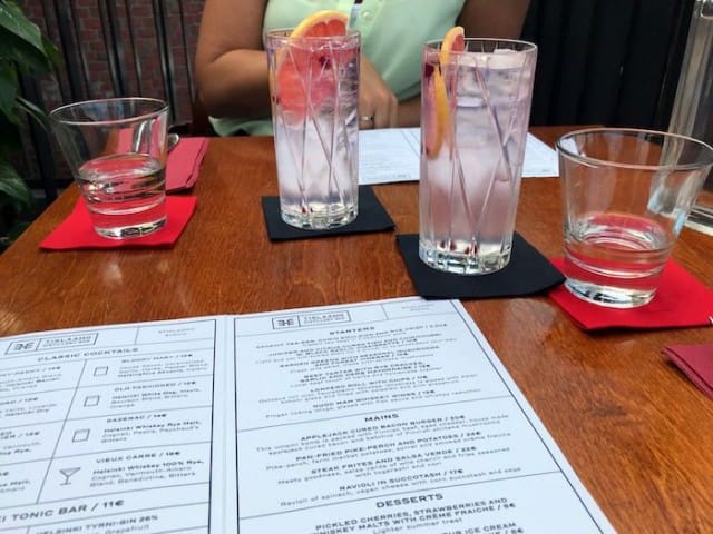 Kuten tislaamossa kuuluukin, sivuutamme ruokajuomina viinit ja muun tuontitavaran ja nautimme annoksillemme sovitettuja cocktaileja. Aperitiiviksi saamme mainion lempeän gin tonicin, joka sopi helteiseen alkuiltaan.