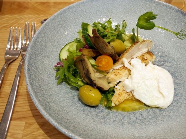 Alkuruoaksi meille tarjoillaan hiilisiikasalaattia uppomunalla. Salaatissa on käytetty monipuolisesti muun muassa fenkolia ja maa-artisokkaa. Hiillos maistuu sopivasti ja annos on kepeän kiva aloitus lounaalle. Se ei kuitenkaan ole liian pieni, täällä tulee varmasti saamaan vatsansa täyteen. Raikasta salaattiannosta saa BistroLounge -kokonaisuuden lisäksi tilattua lounaalla myös erikseen, jolloin tämä Green Deli -annos on hyvä valinta pienempään nälkään tai nopeasti mukaan napattavaksi.