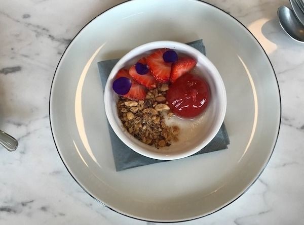 Täyttävien alkupalojen ja pääruokien jälkeen jälkkäriksi kaipasin jo jotain pirteää ja raikasta. Tämä oli onneksi otettu taidokkaasti huomioon menun suunnittelussa ja listalta löytyi juuri se mitä tähän hetkeen kaipasin, nimittäin Lime- kookos pannacotta. Raikas ja suussa sulava pannacotta koristeltuna orvokinlehdillä kruunasi illan täydellisesti. Avecillani puolestaan on täysin oma vatsa herkkuja varten, joten hänen jälkiruoka valintansa oli Uuniomenaa & vaniljajäätelöä, joka oli juuri sopivan täyteläinen ja voinen.