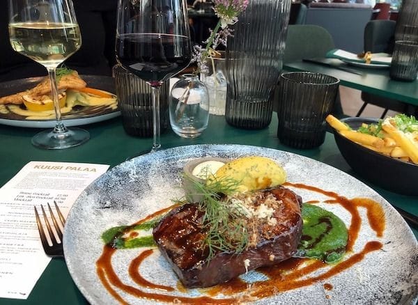 Pääruoaksi valikoituu Puruveden pannuahvenet ja entrecote. Ahvenet tarjoillaan korvasieniraviolin kanssa, jossa sieni on todellakin pääosassa, kuten kuuluu. Entrecote on iso ja maistuva annos. Myös parmesaaniranskalaiset ovat todella hyvät ja niissä on riittävästi parmesaania. Kattauksen viimeistelevät tyylikkäästi mustat ja kultaiset aterimet.
