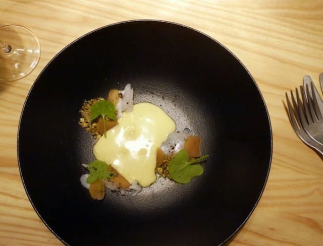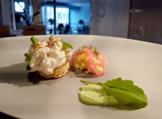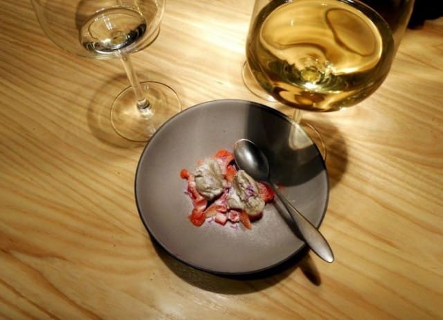 Ostereita tarjoiltiin kahta lajia, ne olivat tuoreita ja niiden lisukkeet oivaltavia. Avecini piti kovasti piimä-tillivinegrettestä ostereiden lisukekastikkeena. Hänestä piimä toi uuden ulottuvuuden merelliseen herkkuun. Fine de Claire -ostereiden koostumus oli napakka, suutuntuma lihaisa ja maukas. Ostereita oli kiva maistella alkuun ja ne kelpasivat oikein hyvin sekä kokeneelle että kokemattomammalle syöjälle.
