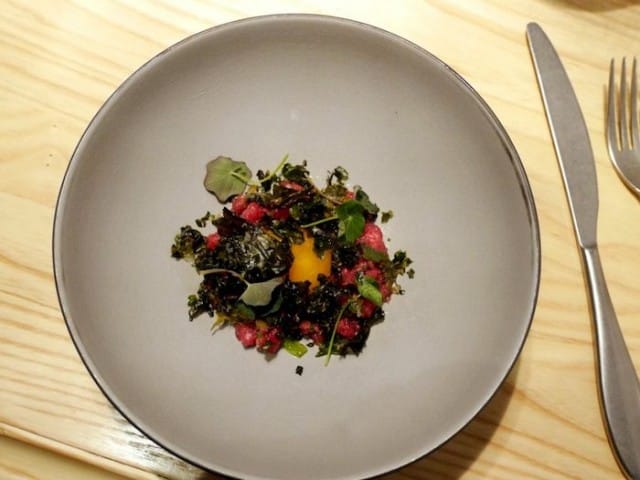On todella hyvä, ettei kalabaarissa nojata pelkästään niihin merenantimiin, vaan uskalletaan käyttää myös (hyvää) lihaa. Tartar oli molempien ruokailijoiden mielestä napakymppi ja liha toi sopivaa vaihtelua pidemmän menun kala-annosten väliin. Ravintolassa on kuulemma aina tarjolla tartaria, eikä yhtään suotta.