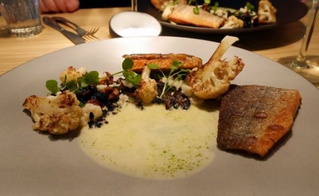 Seuralaiseni mielestä pääruoan kala oli yksi parhaista pitkään aikaan. Hänkin tulee onnelliseksi aina kun saa täydellisesti paistettua kalaa ja annoksen nieriä oli juuri sitä. Nieriän seurana oli korvasieni-kanttarellipaistosta, fermentoitua sitruunaa ja kukkakaalia. Hyvin ajassa kiinni oleva annos oli reippaan kokoinen ja sen kanssa maistui mainiosti lasillinen Petit Chablista.
