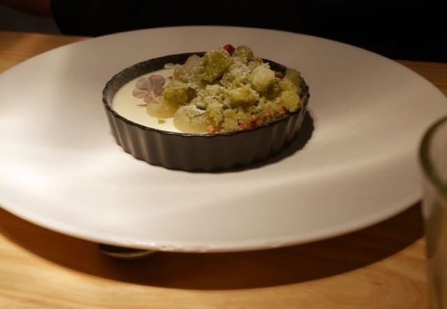 Ostereiden jälkeen saimme heinillä savustettua siika ja pikkelöityä raparperia raparperihollandaisekastikkeella, mantelipähkinämurulla ja kuivatulla nokkosella. Annos oli todella kaunis ja sen idea oli hieno ja maut sopivat erinomaisesti yhteen. Raparperi tuli kunnolla esiin vasta hollandaiskastikkeen jälkimaussa. Annos oli herkkä niin ulkonäöltään kuin mauiltaan, mutta samalla makumaailma oli runsas erityisesti ihanan pähkinämurun ansiosta.