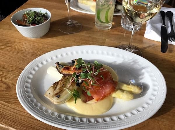Seuraavaksi vuorossa on lohta, parsaa hollandaise ja juustogratinoitua portobelloa. Iso annos on hyvä yhdistelmä ja todella maukas kokonaisuus.