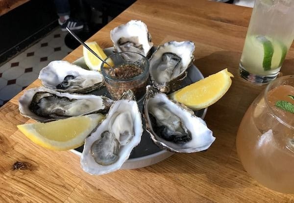 Alkuun saamme erittäin tuoreita ostereita mignonette. Niiden seuraksi kuulemme mukavan tarinan siitä, kuinka niiden pyyntipaikka Hollannissa on kokille varsin tuttu, sillä hänen isänsä asuu paikan lähellä.