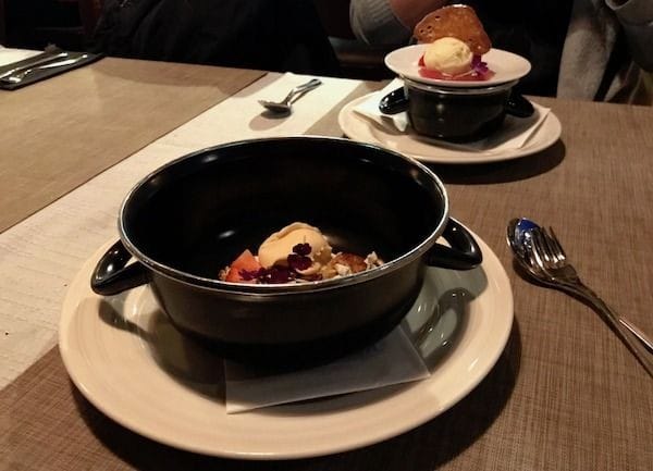 Mysli-jälkkäriannokseen kuului maitokiisseliä, maitojäätelöä ja rapeaa mysliä. Mielenkiintoisen erilainen annos ei ollut kovin makea ja siitä tuli hieman kaurapuuroisa fiilis, jota kattilan käyttö lautasena korosti entisestään, hauskaa!