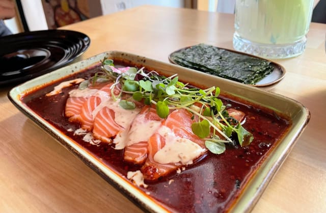 Tässä ravintolassa sormisyötävät ja pientä näperrystä vaativat annokset tarjoavat ruokailun lomaan tervetulleen ohjelmanumeron. Yksi herkullisimmista alkuruoka-annoksista olikin tulisen soijakastikkeen, merileväarkin ja riisin kera tarjoiltu sashimi-lohi, joista ruokailija pääsevät askartelemaan itselleen taco-tyyliin käsin syötävän annoksen.