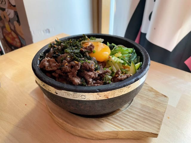 Yksi ravintolan suosituimmista annoksista ei paljoa esittelyä kaipaa. Sehän on totta kai kuumassa kulhossa tarjoiltu bibimbap-kulho, joka meille tarjoillussa versiossa piti sisällään kasvisten, kananmunan ja riisin lisäksi ohueksi suikaloitua naudanlihaa.