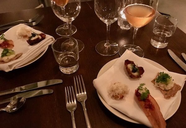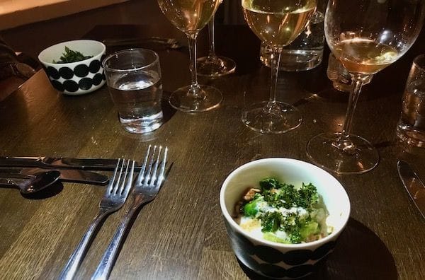 Vuoden 2020 pop up alkoi lupaavasti, kun saimme eteemme kauniisti asetellun lautasen pieniä makupaloja. Artisokkaa, siikaa, naudan sisäfilettä sekä suolaisen madeleinen. Miten ihana aloitus!