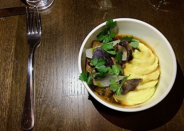 Seuraava annos oli kuin tehty sateisen sumuiseen sunnuntai-iltaan. Annos spelttipuuroa oli keitetty risottomaisesti kotimaiseen luomuvuohenmaitoon. Sen mausteena käytettiin ilmakuivattua kinkkua, lämmintä ruusukaalisalaattia, mantelimaitoa ja pähkinää. Tämä jos mikä on lohturuokaa parhaimmillaan.