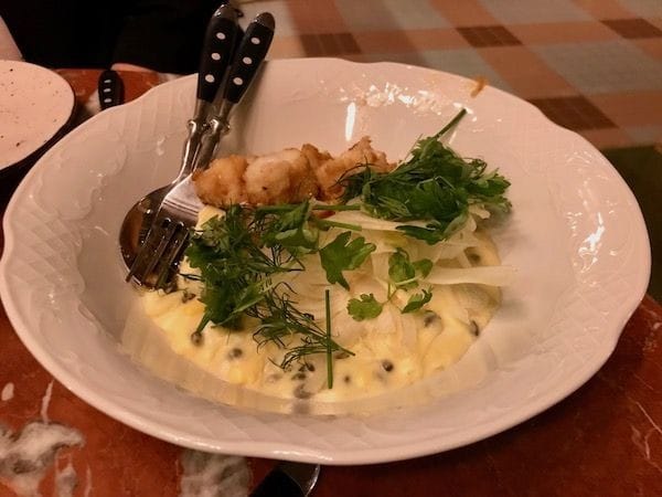 Vaikka sidet ja pääruoka-annokset ovat itsessään jo aika isoja ja varmasti riittävät vähän pienemmän nälän taltuttamiseen, ei luonnollisestikaan voitu kieltäytyä maistelemasta myös alku- ja jälkiruokia. Alkuun tilasimme mausteista merirapukeittoa, grillattua mustekalaa ja fenkolirapusalaattia. Hauskassa annoksessa keitto kaadetaan vasta pöydässä kulhossa jo olevan salaatin päälle. Mustekala ja fenkolisalaatti tekevät myös oman twistinsä ja keitto on aika uudenlainen toteutus klassikosta, vaikka perinteisiä makuja liemestä löytyykin. Tämän annoksen saa myös pääruokakokoisena.