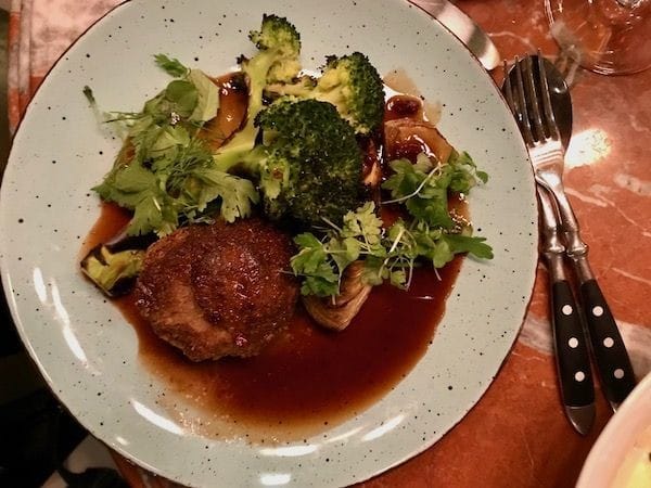 Mutta, jos mennään nyt näihin tutustumiskäynnin annoksiin, niistä tulee ehdottomasti nostaa esiin hirviwallenberg savustetulla sipulilla ja tummalla puolukkakastikkeella. Se myytiin meille lauseella ”aivan tajuttoman hyvää!”, eikä tuossa lauseessa ole liiottelun häivääkään, se oli todella hyvää. Mehevää ja maukasta, ja riistan käyttöhän on myös aina ilmastoteko.