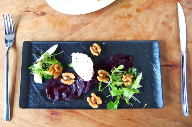 Milka poimii listalta suosikkeja, joita lähdemme seuralaiseni kanssa testaamaan. Rugosan keittiö on sekoitus Välimerta ja Skandinaviaa sisältäen runsaasti klassisia eurooppalaisen keittiön elementtejä, mutta myös erikoisempia yksityiskohtia. Alkuun maistelemme Rugosan paahdetut punajuuret sekä kampasimpukat, joista kumpikin annos onnistuu yllättämään.