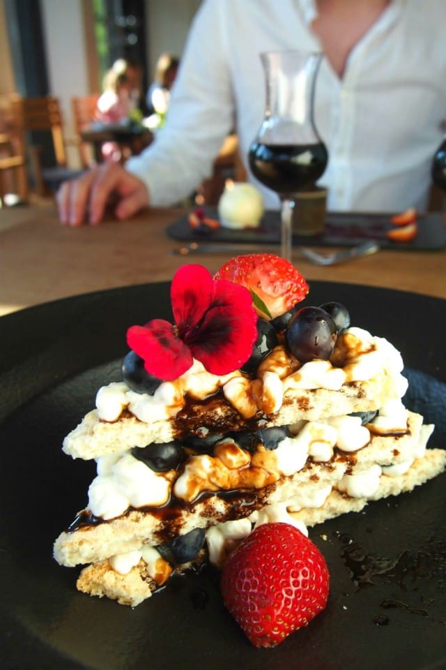 Jälkiruokaviineistä kysyttäessä Milkan silmät syttyvät niin, ettei ole vaikea arvata seuraavaksi olevan tiedossa jotain erityistä. Henkilökunnan suosiksi noussut Xarada Mistela Negra on tuotekuvauksen mukaan luumuinen ja kirsikkainen, mutta maistuu suomalaisessa suussa ilmiselvästi mustikalle. Kertakaikkisen upea viini olisi itsessään ajanut jälkiruuan aseman ongelmitta, mutta toisaalta enpä ole vielä eläessäni törmännyt tiramisuun, jota en haluaisi maistaa. Rugosan tiramisu on korkeudessaan komea ilmestys, sillä pehmeäksi uitetut savoiardinkeksit on korvattu ryhdikkäillä gluteenittomilla mantelikekseillä. Jos tiramisussa on hieman poikettu perinteistä, Saaren suklaafondant taas on valuvana ja syntisen suklaisena ylistys klassiselle ranskalaiselle keittiölle.