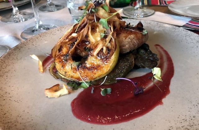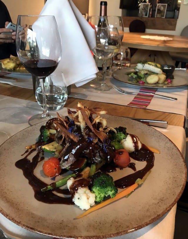 Pääruokavalintamme hajaantuvat enemmän ja itse valitsen listalta ankkaa. Sen pinta olisi kaivannut hieman kuumempaa pannua, kuten kuulemma myös kalankin. Noin muuten ankka on oikein maukasta, annoksessa on paljon syömistä ja sen kanssa tarjoiltu raparperikastike maistuu marjaisalle, mutta on silti sopivan hapan. Vihannekset, ankka ja kastike sopivat hyvin yhteen ja ne on laitettu esille kauniisti. Makeahko annos on hauska ja sopivan kevyt, myös muita annoksia kehutaan maistuviksi.
