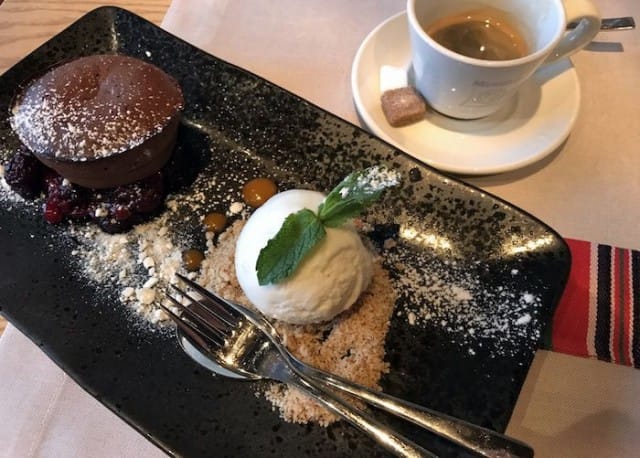 Jälkiruoaksi tilaan perinteistä, mutta aina niin hyvää suklaafondantia, joka katoaa lautaselta nopeasti. Se on maistuva päätös aterialle, mutta se ruoista. Vaikka ruoka ja sisustus ovat molemmat varsin kivoja, kumpikaan niistä ei ole Kaerajaanin ykkösjuttu, vaan se on ravintolan yläkerran vessa! Kyllä, vessa, muttei mikä tahansa vessa.